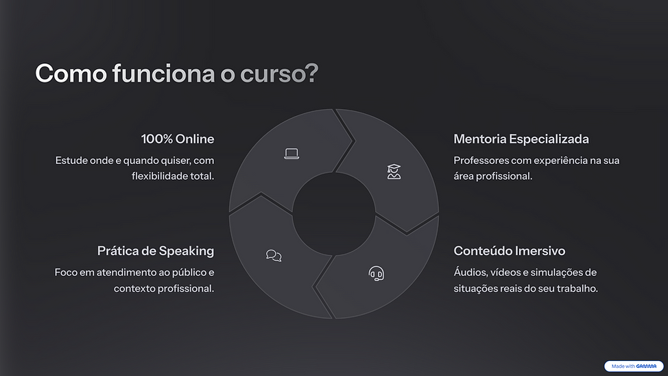 Vocabulário, áudios com sotaque, simulações de atendimento real.